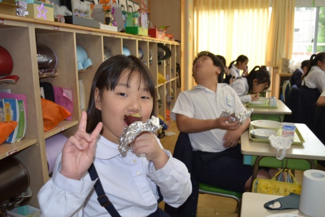 また、この日は久しぶりに登場した「かたじい(片付けを得意とする仙人)」によるアルミホイルのたたみ方もが給食スライドで流されました。約半年ぶりの「かたじい」の登場に子供たちは大喜び みんな小さくきれいにアルミホイルをたたみ、ゴミの削減にも貢献しました。