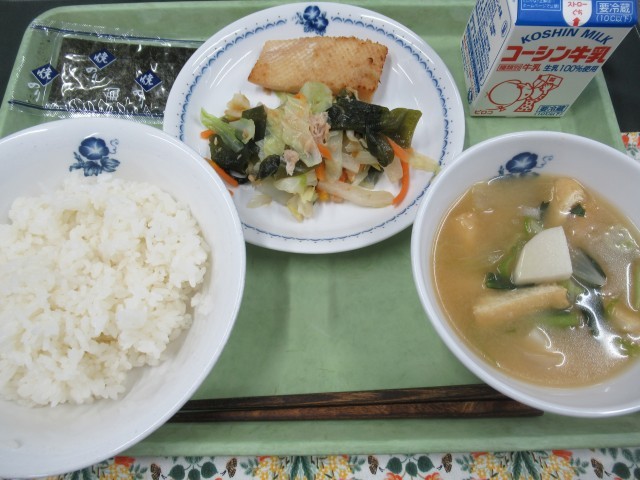 ・牛乳 ・ご飯 ・焼きのり ・いかの生姜焼き ・わかめとツナのサラダ ・里芋のみそ汁