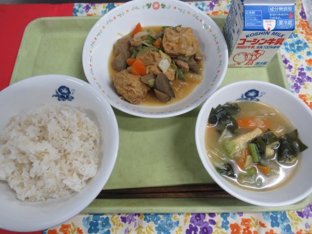 ・牛乳 ・もち麦ご飯 ・がんもどきと野菜の煮物 ・キャベツとわかめのみそ汁