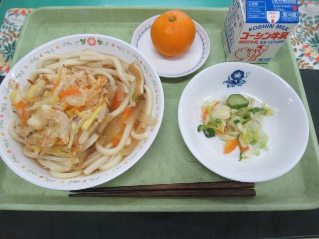 ・牛乳 ・かき揚げうどん ・白菜の即席漬け ・みかん