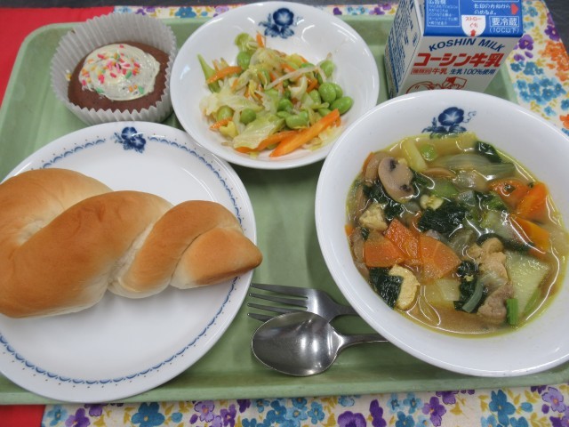 ・牛乳 ・ツイストパン ・カレースープ ・キャベツと枝豆のサラダ ★オリジナルチョコケーキ