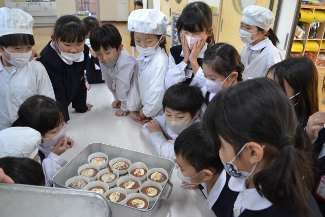 ココア味の生地をカップに入れてオーブンで焼き上げます。それにホワイトチョコレートソースを塗り、その上からカラフルなチョコレートで飾り付けをしたら、給食室オリジナルの美味しいチョコレートケーキが完成しました。