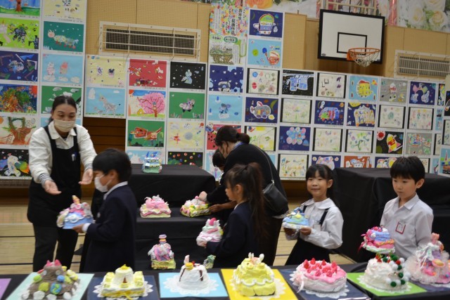 「1年生のみんな、展覧会で『オリジナルデコレーションケーキ』を作ってくれてありがとう。おかげでこの美味しいケーキが食べられるー!」