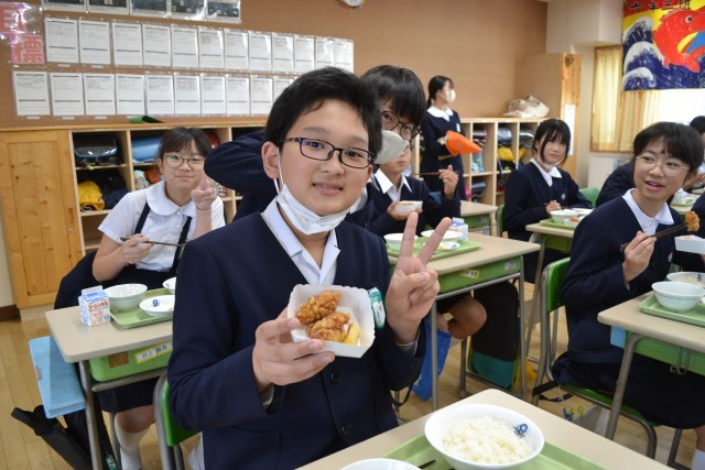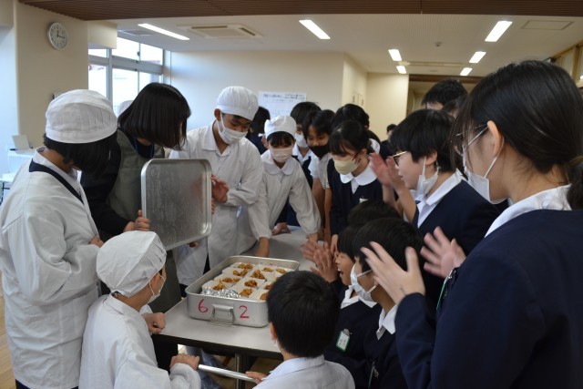 6年生の教室では、担任の先生がバットのふたを開けると大きな歓声があがりました。そして、美味しくいただく笑顔の顔、おかわりじゃんけんでの悲喜こもごも…