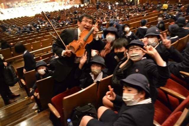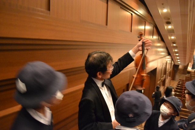 開演前に根岸小学校の観覧席においで下さり、様々なお話をしてくださったり、終演後にもすぐに舞台裏から観覧席においで下さり、御自身のヴァイオリンを間近で見せてくださったり、弓に触れさせてくださったり、こちらもとてもよい体験になりました。