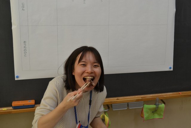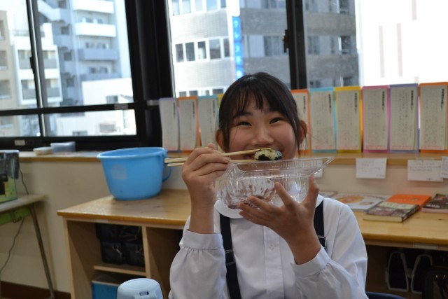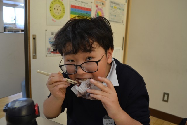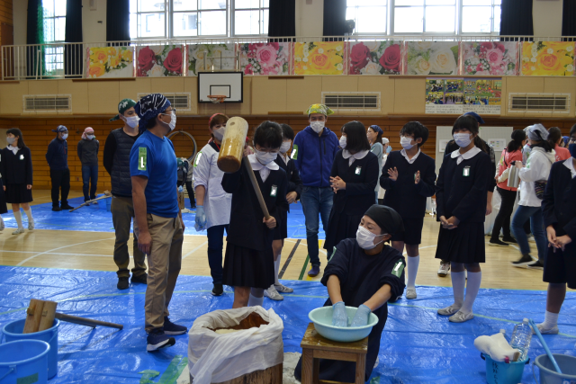 そして、つきあがったおもちは家庭科室で磯辺と餡の味に調理されすぐに教室に届きます。