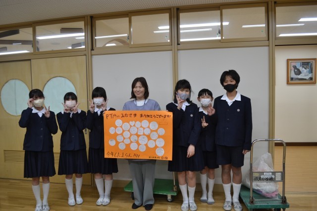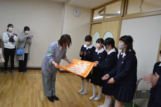 こういった声も聴かれました。おもちつき大会終了後には、6年生の代表児童が御礼の寄せ書きを御担当された校外生活委員の皆さんにお渡しする場面もありました(写真の8枚目と9枚目)。