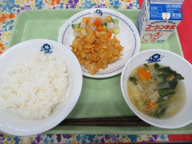 ・牛乳 ・ご飯 ・鶏肉のフレーク焼き ・コロコロサラダ ・青菜とレンズ豆のスープ