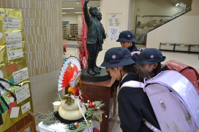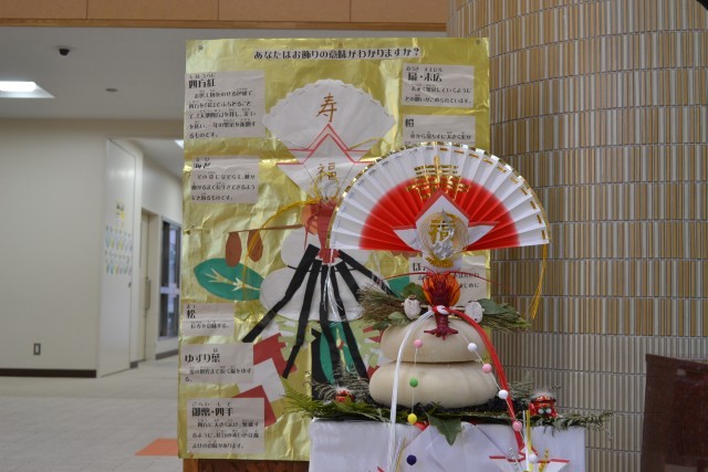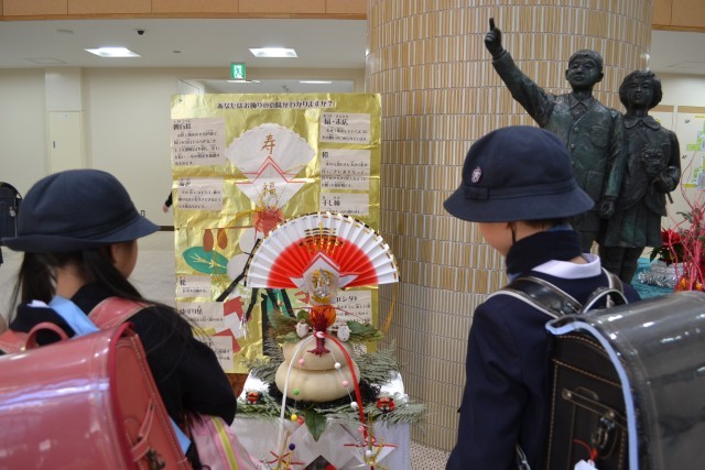 縁起物の鏡餅が玄関ホールで子供たちを迎えます。