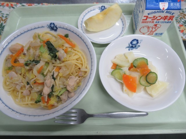 ・牛乳 ・白菜と鶏肉のスパゲッティ ・じゃがいものサラダ ・りんご