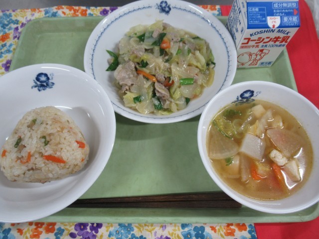 ・牛乳 ・鶏ごぼうご飯 ・豚肉の塩こうじ炒め ・けんちん汁