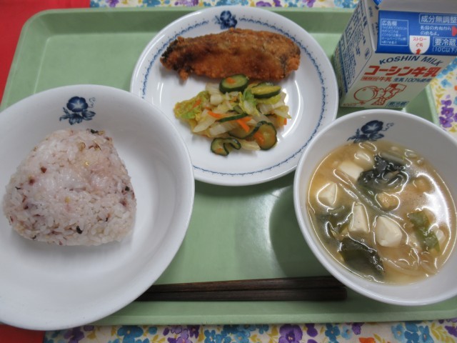 ・牛乳 ・七穀ご飯 ・ほきの竜田揚げ ・白菜のおひたし ・とうふとわかめのみそ汁
