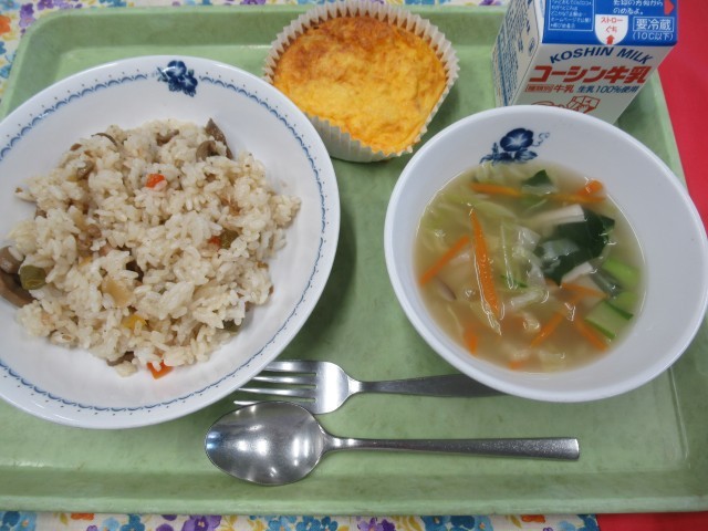 ・牛乳 ・ブラウンピラフ ・チーズオムレツ ・青菜のスープ