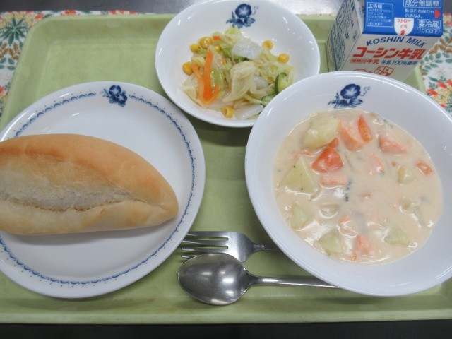・牛乳 ・ソフトフランスパン ・鮭のクリームシチュー ・こんにゃく入りサラダ