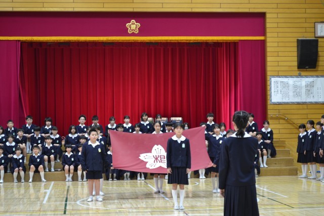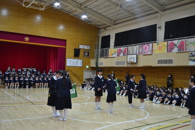 1部では、代表委員の6年生から5年生へ校旗の引継ぎ、代表児童によるスマイル班の引継ぎ、続いて6年生からの卒業記念プレゼント授与がありました。