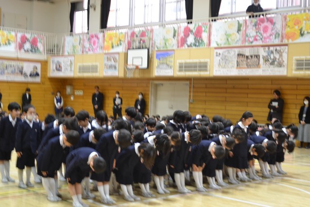 第2部は各学年からの出し物です。歌や呼びかけ、呼名など在校児童がこれまで準備してきた「6年生への感謝の思い」を伝えることができました。各学宇年の出し物を観ているときの6年生の表情はどれも皆穏やかで、優しいものでした。きっとこの1年間の思い出を振り返りながら観ていたのではないでしょうか。