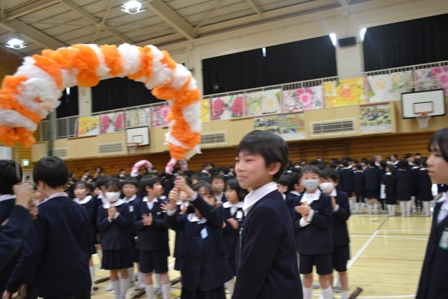 大きな拍手の中、5年生児童のリコーダー演奏「蛍の光」、3年生児童が持つ花のアーチをくぐって退場する6年生