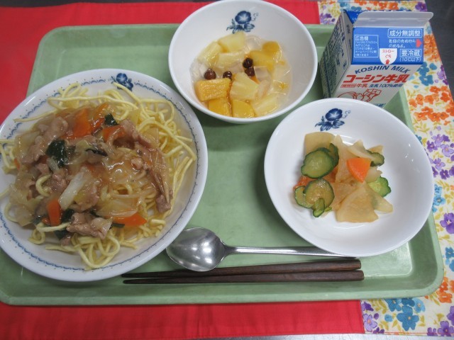 ・牛乳 ・かた焼きそば ・大根ときゅうりのピリ辛漬け ★みつ豆
