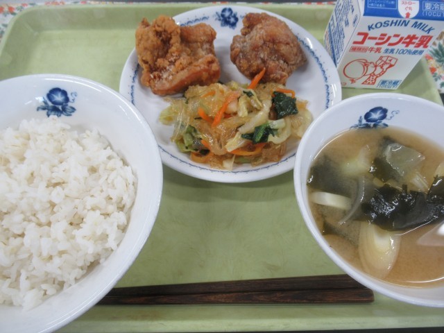 ・牛乳 ・麦ご飯 ・鶏肉のから揚げ(カレー味 又は にんにくじょうゆ味) ・糸寒天のサラダ ・わかめと長ねぎのみそ汁