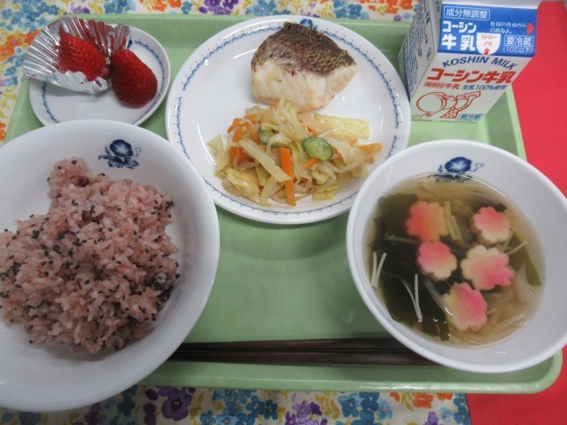・牛乳 ・赤飯 ・鯛の塩焼き ・みそドレサラダ♪ ・桜満開すまし汁 ・いちご