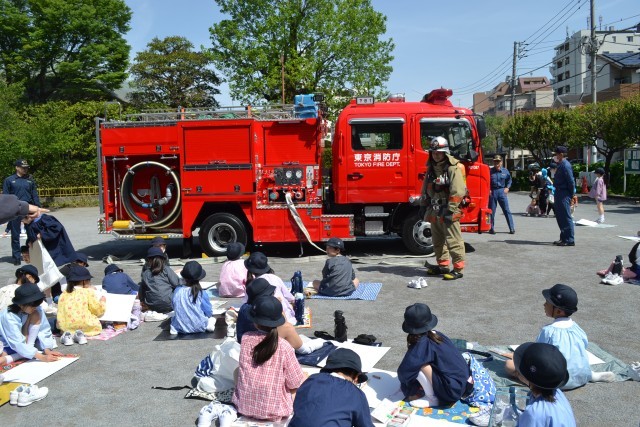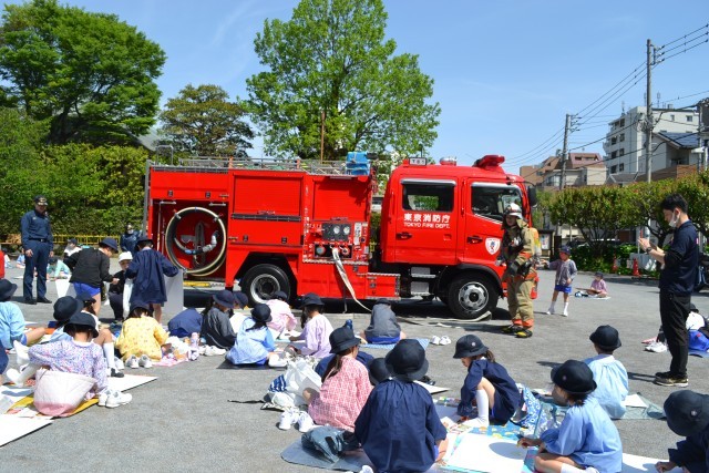 根岸小学校では毎年、東京消防庁下谷出張所の皆様と上野消防団第5分団の皆様の御協力をいただき、低学年による消防写生会を行っています。