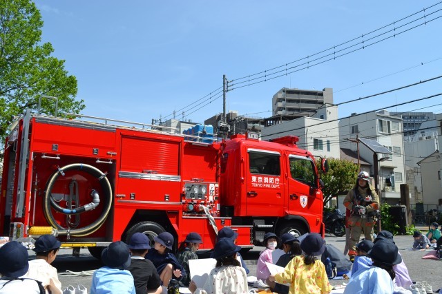 この日も緊急出動から戻ってきたポンプ車を目の前にして子供たちは大喜びでした。