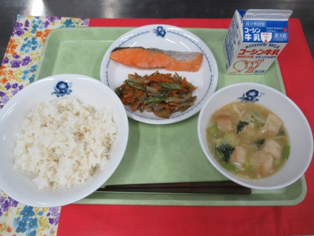 ・牛乳 ・もち麦ご飯 ・鮭の塩焼き ・ごぼうのきんぴら ・おふのみそ汁