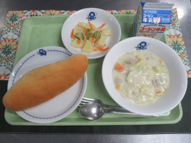 ・牛乳 ・コッペパン ・春キャベツのシチュー ・新じゃがいものサラダ