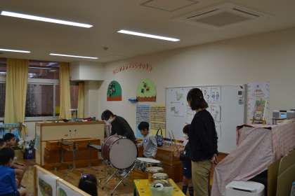 活動内容は太鼓や鉄琴などの楽器を使って音を出す楽しさを味わうものでした。ぞう組さんの9人のおともだちはとても上手に楽器で音を出すことができていました。