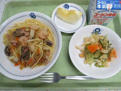 ・牛乳 ・シーフードスパゲッティ ・フライドビーンズサラダ ・りんご