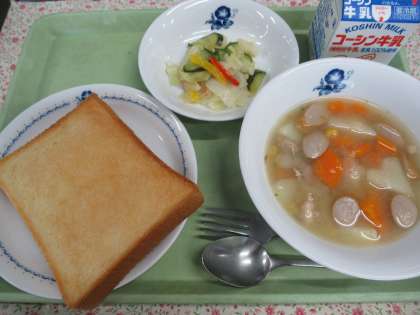 ・牛乳 ・シュガートースト ・ウインナーとじゃがいものスープ ・カラフルサラダ
