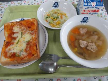 ・牛乳 ・ピザトースト ・コールスローサラダ ・レンズ豆のスープ