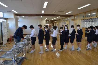 本校では、栄養士の先生が「全国味めぐり」を企画し、10名の調理員さんたちが腕に縒りをかけて全国各地の郷土料理をつくってくださいます。