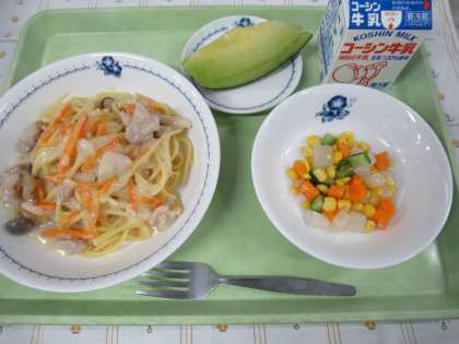 ・牛乳 ・豆乳クリームスパゲッティ ・コロコロサラダ ・メロン