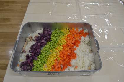 さつまいも、にんじん、パプリカ、ホールコーン、枝豆の彩り鮮やかな「にじいろライス」が給食に登場しました。