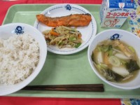 〈献立〉・牛乳 ・麦ご飯 ・鮭の香味焼き ・野菜のごま酢和え ・かぶのみそ汁〈食...