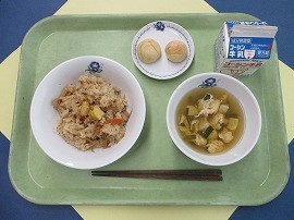 そこで、栗を使った『くり五目ご飯』とお団子をイメージした『お月見焼きドーナッツ』の給食です♪