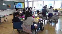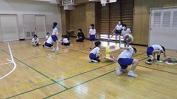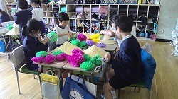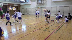 花笠音頭の練習を始めたころは画用紙の笠で練習していましたが、全部の振り付けが覚えられたので本番用の笠を作って練習を始めました。この日はグループごとに練習をしました。自分たちの練習動画を見て、もっと良くしたいところを見つけて練習しました。練習の成果をクラスごとに見合って、友だちの頑張りを互いに見つけ合うことができました。
