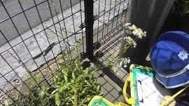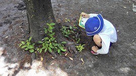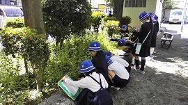 理科で春の植物の観察をしました。教室で虫眼鏡の使い方や危険な植物や動物について学んだ後、校舎の外に出ました。玄関前の広いスペースには、様々な樹木や野草が生えていました。子供たちは張り切って隅々まで植物を調べて、気に入った植物の観察カードをかきました。