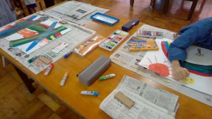 来週は、できあがった虹の形や色から思いついたことをクレパスで書き足して仕上げていきます。