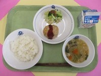 牛乳 とり五目ごはん さばのごまみそ焼き 白菜ともやしのおかか煮 にらたま汁