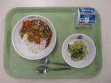 給食がついに始まりました。 最初のメニューはカレーライスです。 1年生は、初めて...