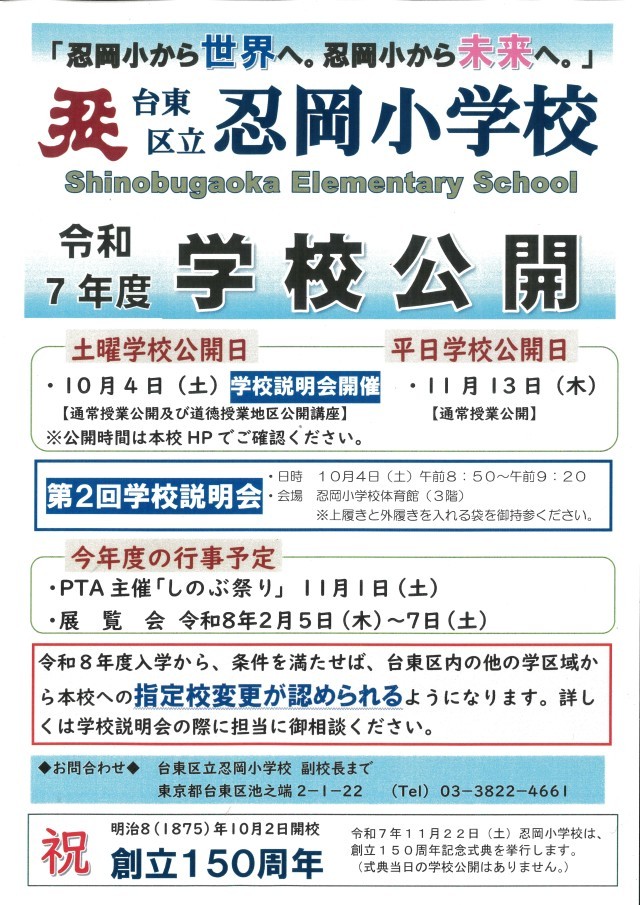 「学校説明会」のお知らせ 公開日 2025/10/02 更新日 2025/10/02 全学年 10月4日(土) 8:50~ 本校体育館にて「学校説明会」を開催いたします。2校時と3校時には授業公開も行っています。ぜひご来校ください。