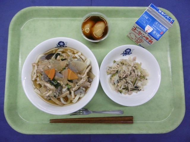 きょうのこんだては、煮込みうどん、ツナと野菜のソテー、お月見団子、牛乳です。