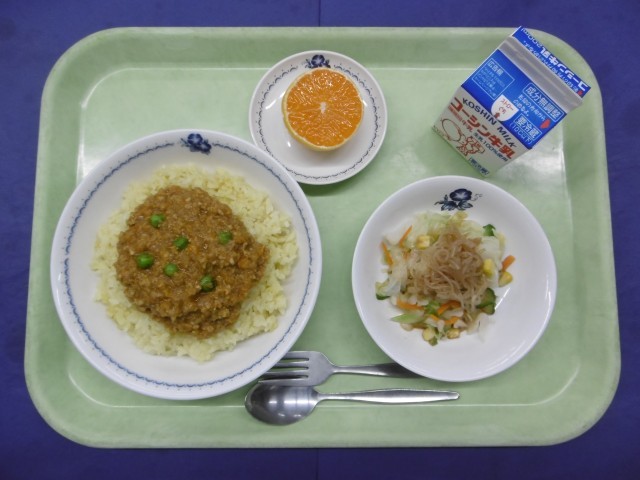 きょうのこんだては、ドライカレー、こんにゃくサラダ、果物(みかん)、牛乳です。