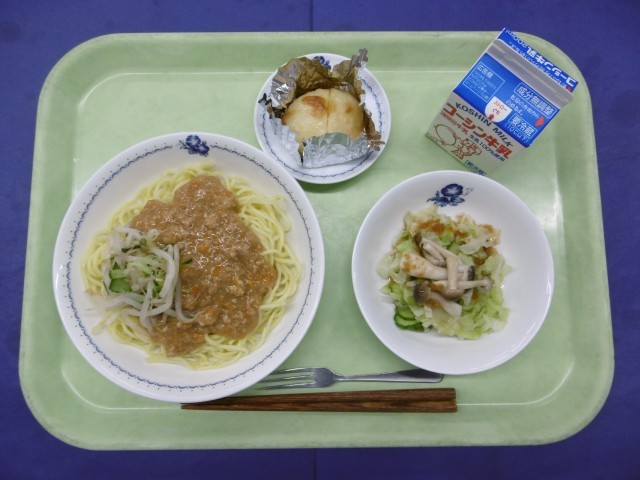 きょうのこんだては、ジャージャー麺、きのこと茹で野菜、ベイクドポテト、牛乳です。