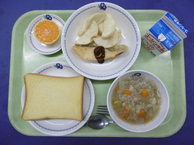 きょうのこんだては、パンプキンパン、フィッシュ&チップス、スコッチブロス、果物(みかん)、牛乳です。