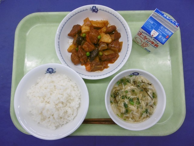 きょうのこんだては、ごはん、インド風うま煮、もずくのかきたま汁、牛乳です。