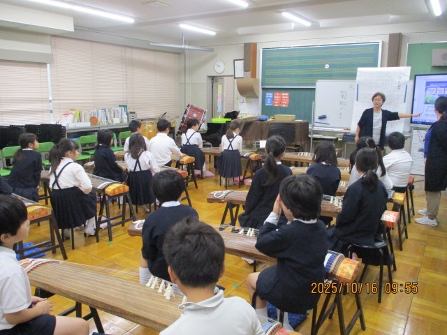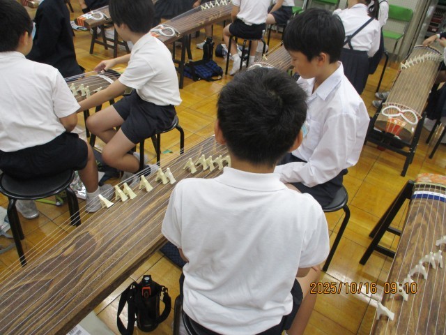10月16日(木)に、外部講師の先生をお招きして箏の学習を行いました。最初は少し緊張した様子でしたが、講師の先生の丁寧な指導のもと、「うさぎ」の演奏に挑戦しました。絃の響きを感じながら、一音一音を大切に弾こうとする姿が見られました。来週の授業でも引き続き練習を重ね、さらに美しい音色で演奏できるようにしていきます。
