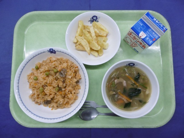 きょうのこんだては、チキンライス、豚肉と野菜のスープ、スパイシーポテト、牛乳です。